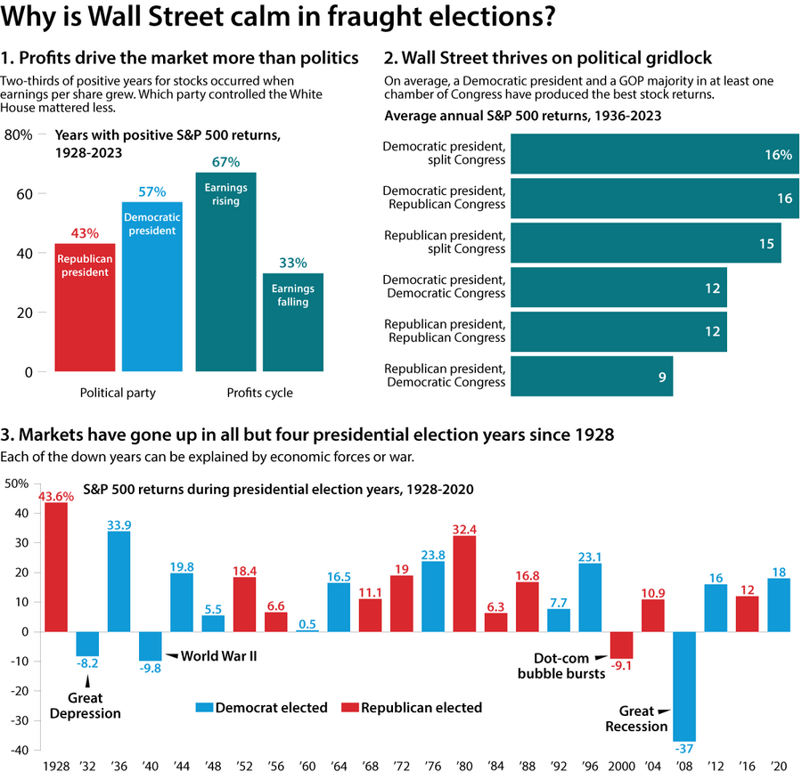 The stock market has remained buoyant even in a race between two starkly different candidates and with no clear sense of which one will win. And a good many are predicting stocks will be higher still at year-end. Sure, Vice President Kamala Harris might raise taxes and former President Donald Trump could widen the deficit. But history suggests that elections don’t matter all that much to the stock market, especially if they result in split party control of Congress and the White House.