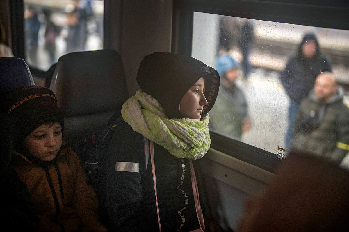 He was on a train packed with women and children fleeing an assault on Kyiv, the capital. They had left behind their homes, their menfolk, and their lives as they rattled through the night into exile. They were numb with disbelief.