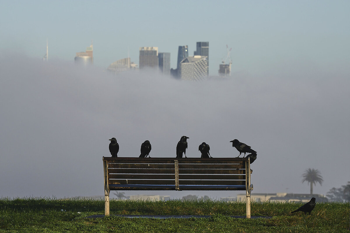 Birds sit on a park bench as dense fog envelopes the Sydney skyline Aug. 5, 2025, grounding planes and, apparently, avians.
