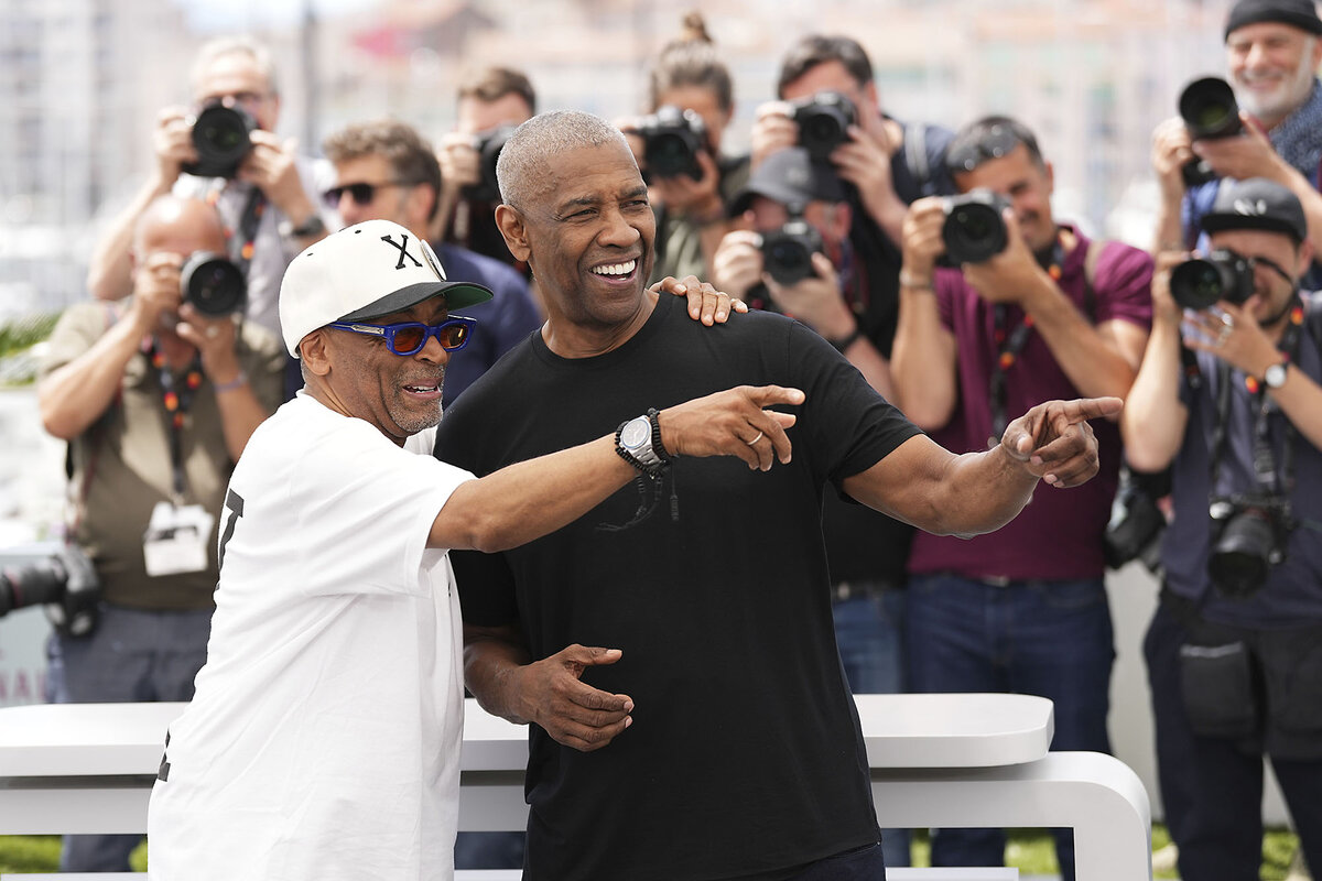 Spike Lee (left) and Denzel Washington take part in a press event for "Highest 2 Lowest" at the Cannes Film Festival, in Cannes, France, May 19, 2025.