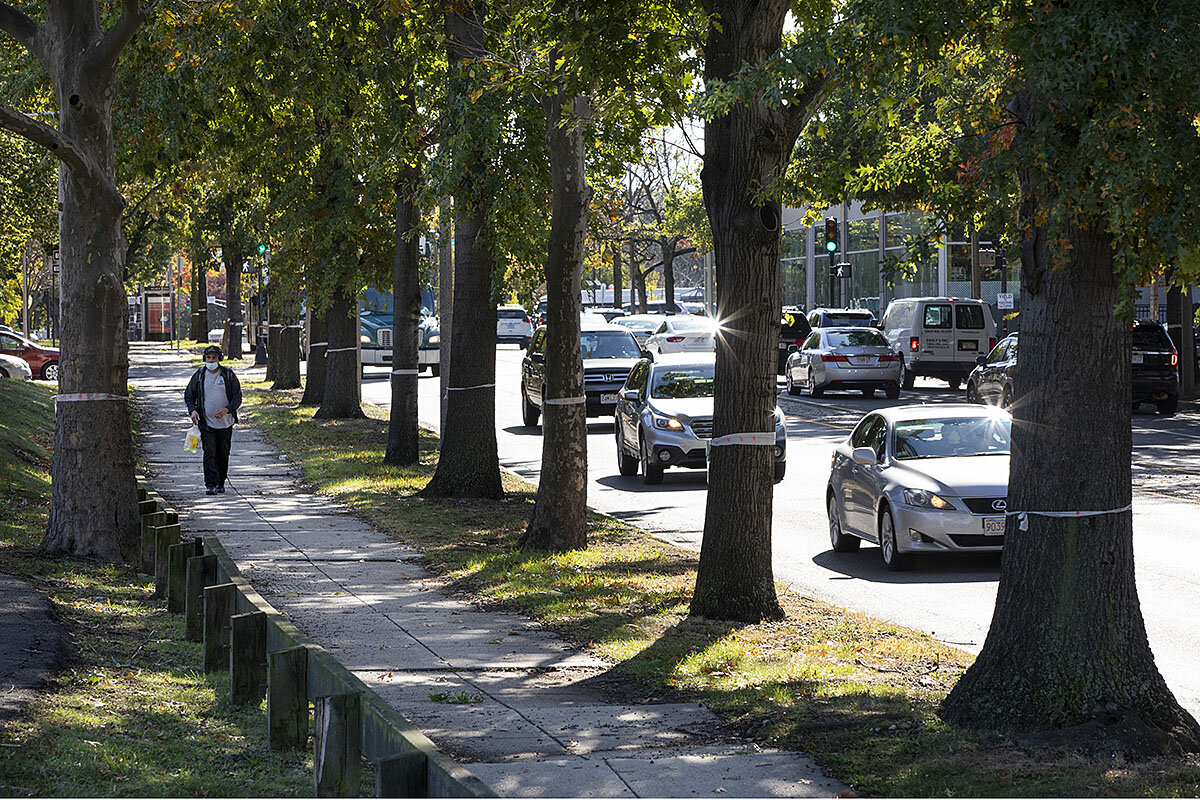 The grumble of car engines whizzing by seems to fade when Yvonne Lalyre talks about the trees. Her eyes sparkle above her mask as she walks the row of natural sentinels between her neighborhood, Roxbury, and the asphalt urban artery that is Melnea Cass Boulevard.