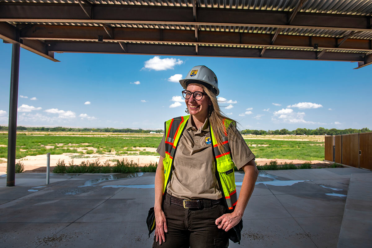 Wearing a bright reflective vest and hard hat over her FWS uniform, she is speaking on a warm late-summer afternoon outside the visitor center. The scene captures Valle de Oro’s current state of transition. Backhoes and heavy construction equipment growl in the distance while cliff swallows, which are already nesting in the roof of the nearby amphitheater, chirp and flutter overhead.