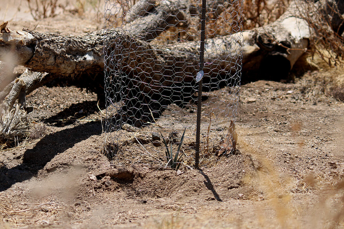 A cylindrical wire cage protects a small green sprout. “This is the only one that’s still green and viable,” says Mr. Willoughby. “All the other ones are dead.” Five other cages, placed about 30 feet apart, wrap around failed plantings. But in the trial and error of re-wilding, even these failures have value. “By far, it was very clear from the data that you needed to have the plant protected from predators like rodents, or that they were just going to get eaten alive.” Uncaged transplants had even smaller chances of survival.