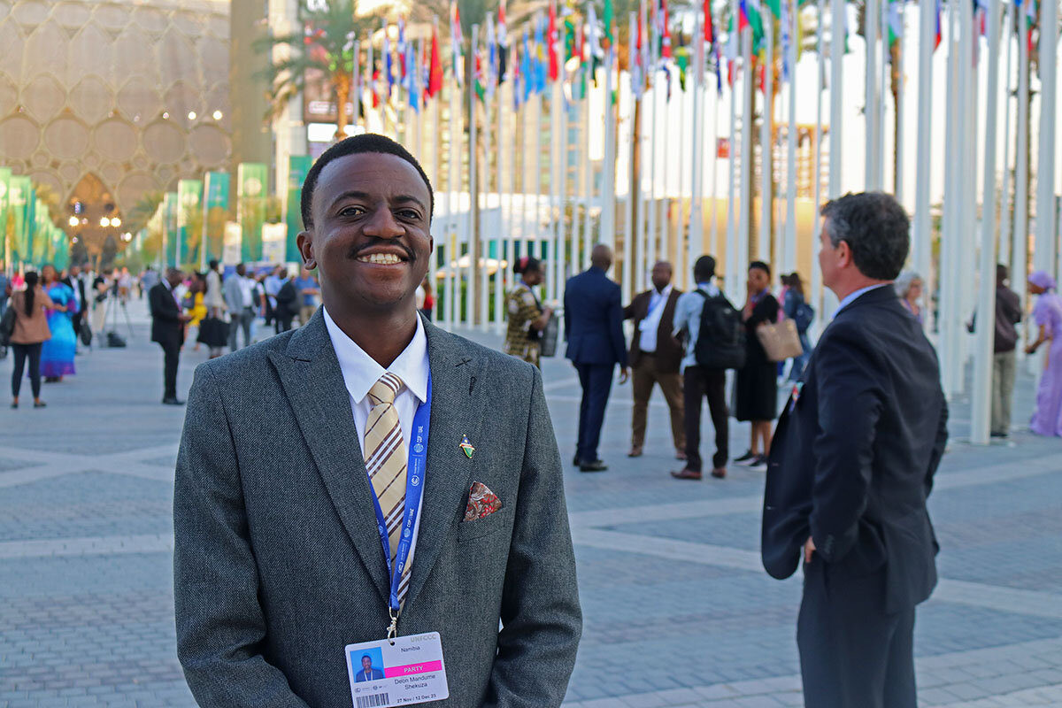 As a climate negotiator for Namibia focusing on the issue of a just and inclusive transition, he is splitting his time advocating for adaptation funding for Africa, negotiating at odd hours day and night, presenting young Namibians’ views at panels, and guiding first-time African youth COP-goers under his wing.