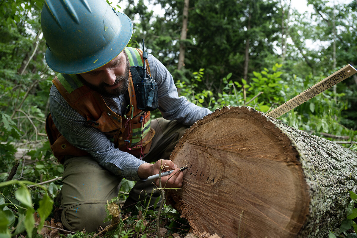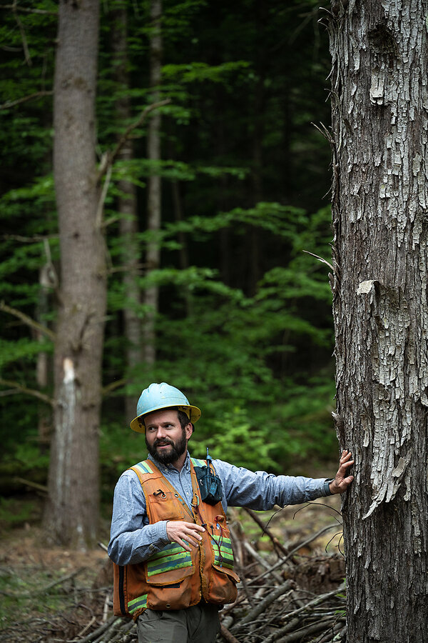“If you value purely economics, that tree gets cut,” Mr. Barrett says. They also left a tall, old white pine that soared above the forest canopy. Its presence suggested that an earlier forester had been thinking ahead, too. “This is a legacy tree that 40 years ago they didn’t cut,” Mr. Barrett says. “They were thinking of seed, thinking of the future.”