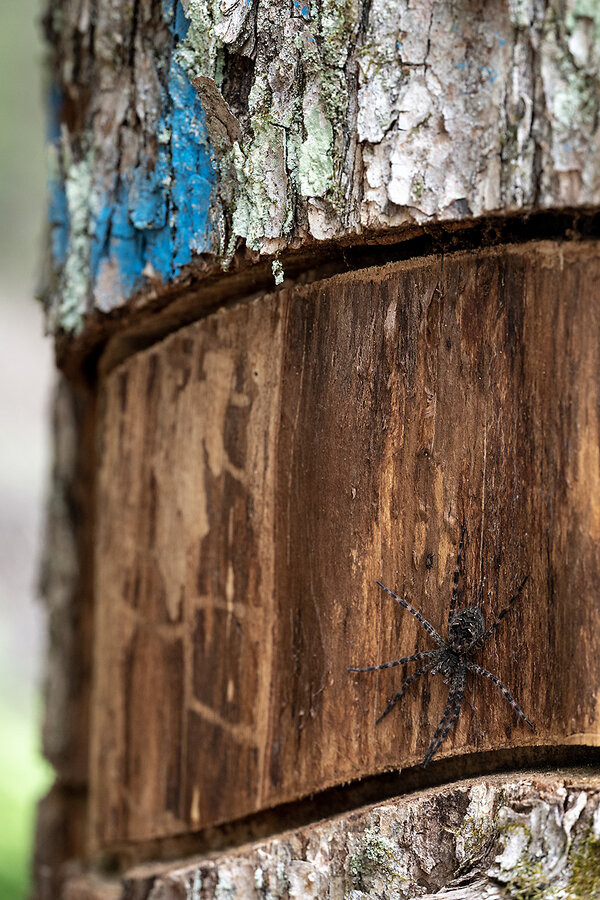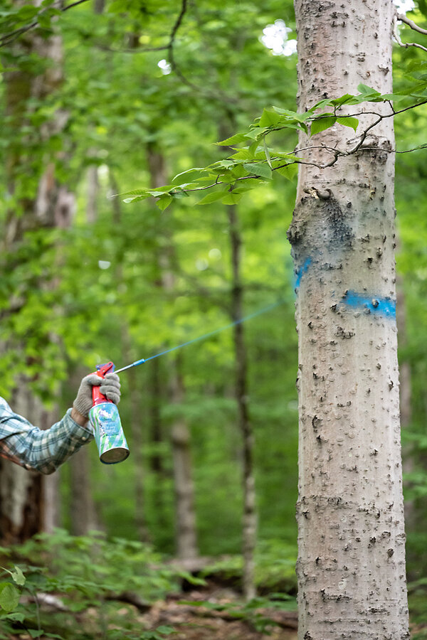 As they made their way through the forest, pushing through ferns and underbrush, Mr. Brennan continued to mark various trees, reaching high to spray a long blue line across the trunk. Sometimes he paused to contemplate what should be done to them. He sprayed a forked red maple with old wounds, but left a bigger maple untouched.