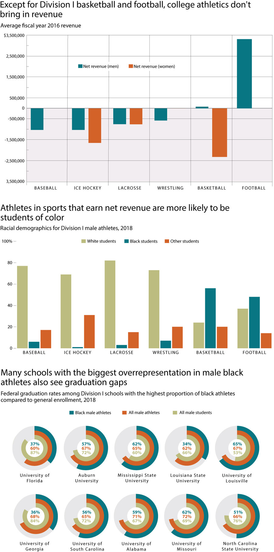 National Collegiate Athletic Association Revenues/Expenses Division I Report 2004-2016; National Collegiate Athletic Association, Demographics Database, 2018; Shaun R. Harper, P.h.D., Black Male Student-Athletes and Racial Inequities in NCAA Division I College Sports, University of Southern California Race and Equity Center, 2018