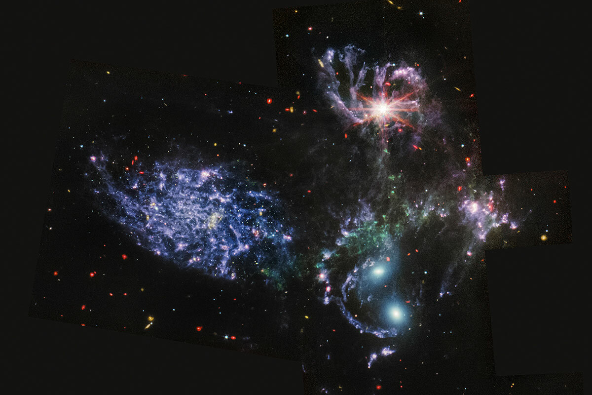 In a galaxy group called “Stephan’s Quintet,” the JWST captured the glowing red merger of two of the five galaxies. The space telescope also unveiled the signature of an active black hole at the heart of one of the galaxies, which offers scientists a chance to study how supermassive black holes consume the material around them in detail.