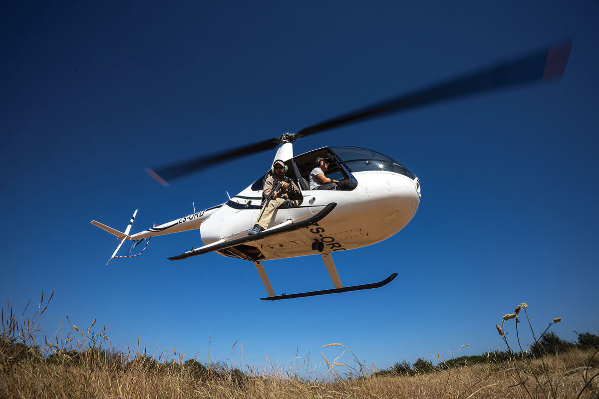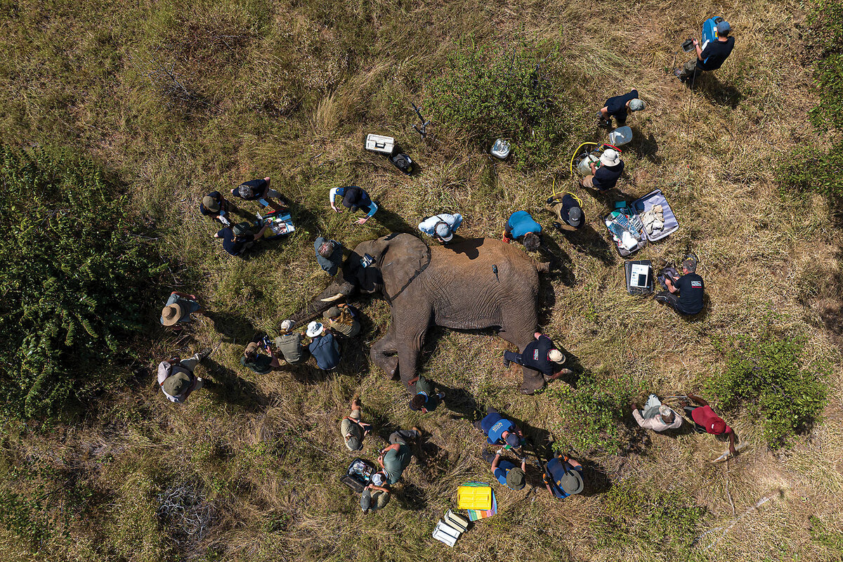 Above a herd of elephants in the Selati Game Reserve in South Africa, helicopter pilot Jana Meyer and wildlife veterinarian Hayden Cuthill scan the bush for the most worthy-looking bull elephant.
