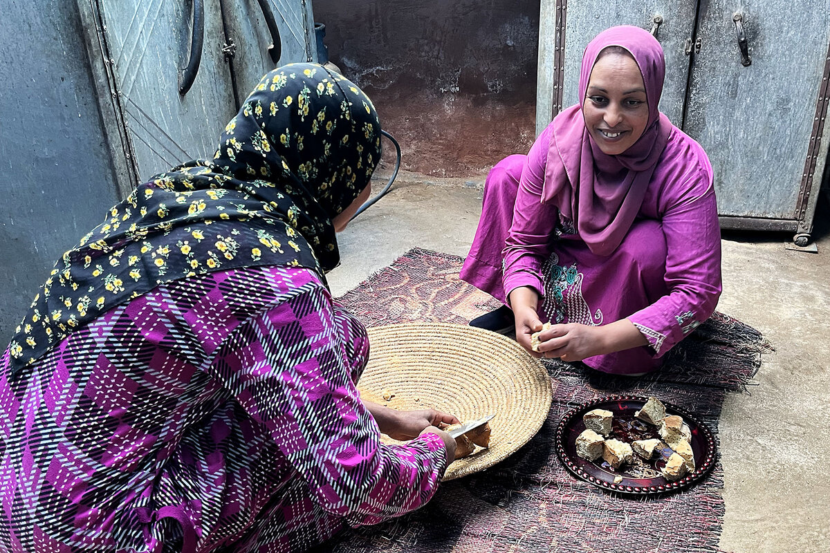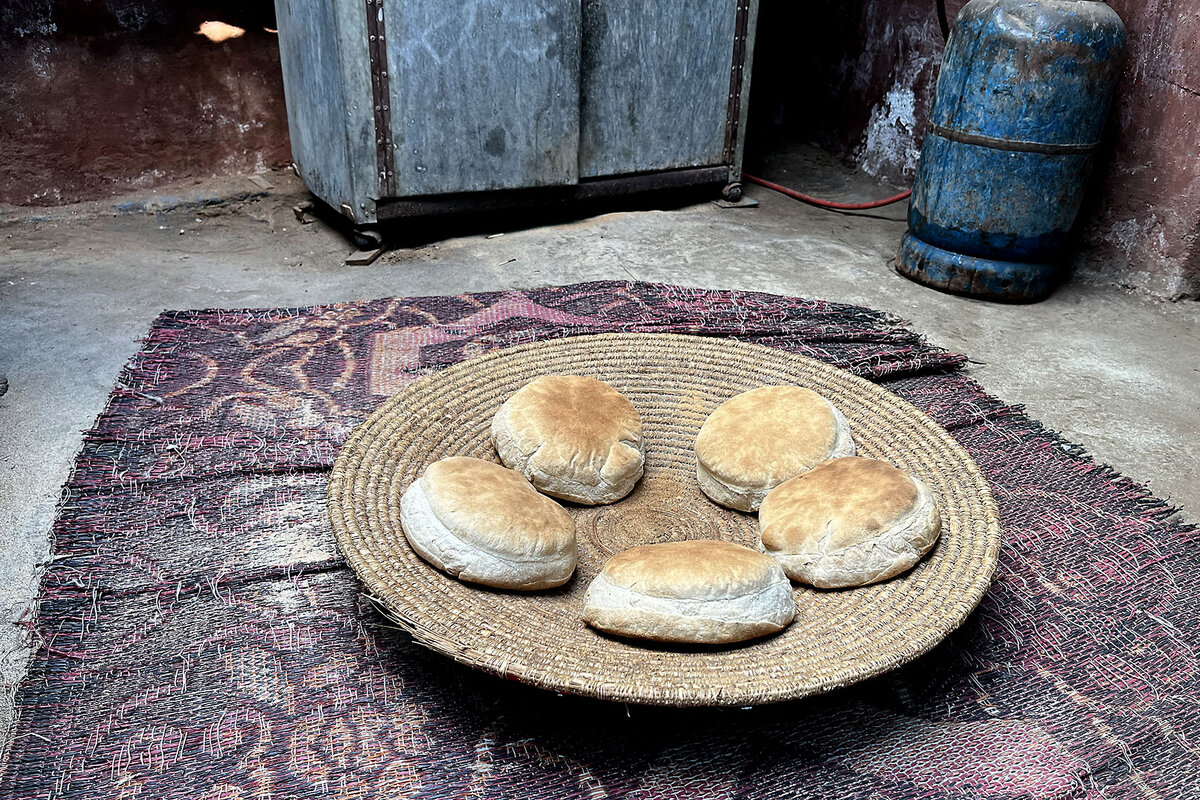 As we arrive, “the government” and “the president” come out to greet us – Sayed’s wife, in a magenta robe and headscarf, and his mother, in black. We are led to the living room – also the television room – where Sayed and his wife, Zainab, demonstrate how to bake round sun bread, which rises in the sun. We each place a long paddle on top of a loaf, flip it, and, with a quick shove, slide it into a gas-fired oven in the corner. Not so easy!