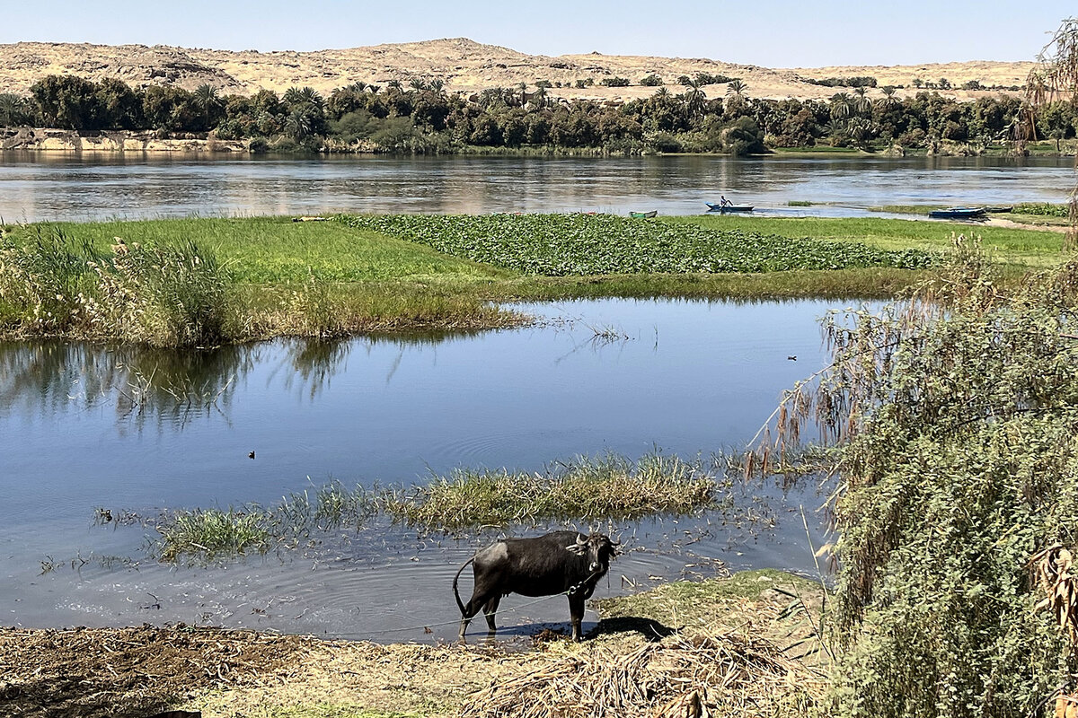 Our first glimpse of the low-lying island, roughly 500 miles south of Cairo, is of a fisherman balancing skillfully atop his rowboat in the bulrushes. Nearby, Sayed Hassan waits for us at the bottom of the gangplank, smiling broadly in his long green robe – a galabia. He leads us along narrow raised paths through groves of mangoes, dates, and bananas. He stops to explain how they reproduce and are harvested, and that Egypt is the world’s largest producer of dates. A pleasantly warm sun filters through the fronds.