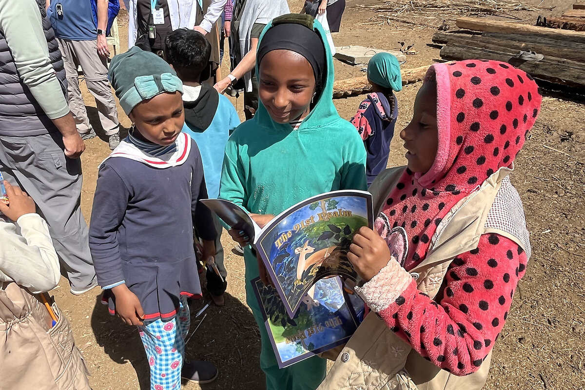 School is over, so while the loaves bake, we go outside to greet the boys and girls. They line up to receive their goodies, beaming. I hand out Crayola crayons and hard candies. A group of girls particularly likes a book of the 91st Psalm , illustrated with Australian animals by a member of our group.