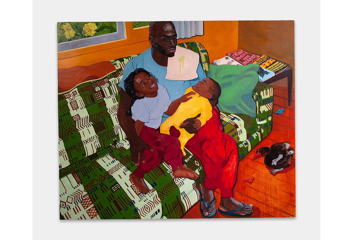 Despite the prominence of a burp cloth on the father’s left shoulder, there is a regality to Mr. Rust’s piece. The patriarch is a towering figure with dark skin, cradling his young daughter and infant son. The couch they are sitting on has an African motif, and a nearby table holds pieces that are influential to Mr. Rust. One of those is “Homegoing” by Yaa Gyasi, a book of interlinked tales that tell the very real stories of the slave trade and effects of trauma over decades.
