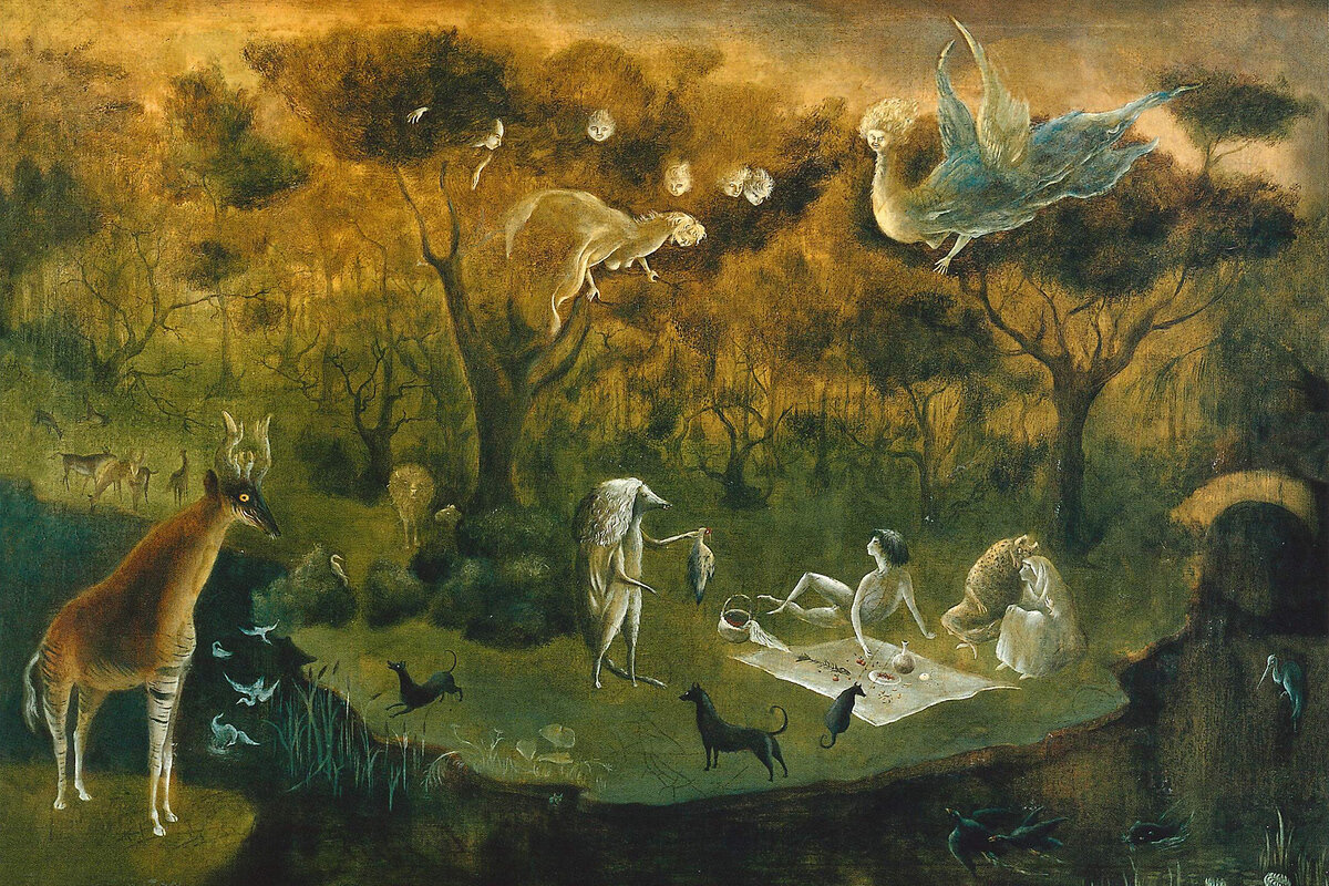 In the 1950 painting “Pastoral,” water fowl, a hyena, and other animals congregate around an androgynous couple as ethereal animal-human hybrids float above. Ms. Carrington often emphasized the coexistence of humans and animals in her work.