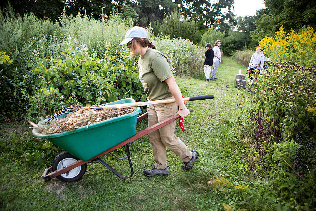On a recent Wednesday, 15 volunteers, most of whom were new to BFFC volunteer days, got to work removing mugwort, a pesky medicinal and aromatic weed, from around a pear tree. This also helped make room for volunteers to plant native bee balm. Once the weeds were pulled, volunteer stewards used a natural weeding process that would suppress the plant’s return by laying the picked mugwort back down in thick mats and placing big sheets of cardboard on top. The cardboard acts as a new soil layer. It’s called repurposing, and it is how many BFFC sites transform from abandoned plots.