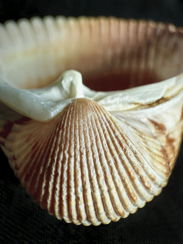 I nod hello, but my gaze shifts to his hands and the shell cradled in the basket of his fingers. The specimen is flat and round, about the size of a sugar cookie. Its most striking feature is the unbroken whorl of white and brown bands that swirl from its center to its outer edges. It’s perfect, almost unreal, as if it’s been plucked from an underwater bakery case and decorated by waves.