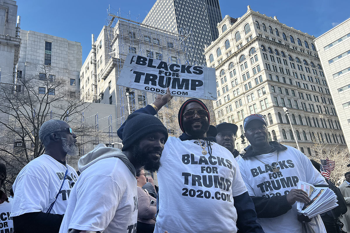 Maurice Symonette, head of a group called Blacks for Trump, has a queue of reporters waiting to speak to him. A radio host from Miami, he flew in with about a dozen members to attend the protest, and they are wearing matching white T-shirts.