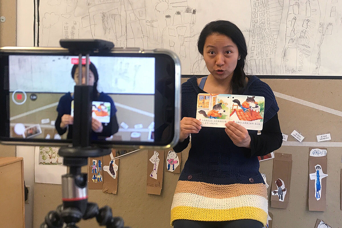 It’s part of an effort to build a virtual library for families. The recordings by native-speaking staff would help students keep up with lessons and stay connected to teachers. “Even facing the camera, it still feels like … they are there listening to me,” says Ms. Ren.
