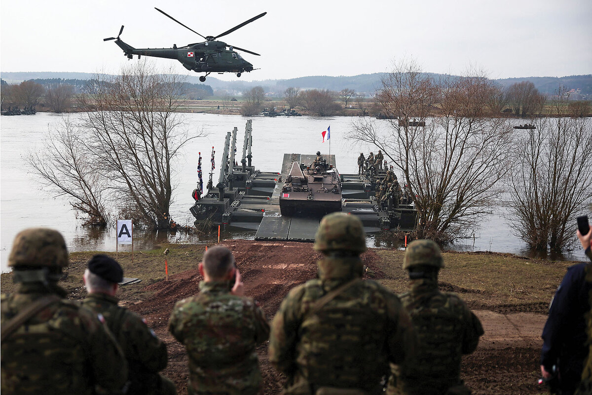 Fighter jets scrambled low and loud, prepared to quash enemy fire, as military vessels quickly ferried tanks across Poland’s longest river, the Vistula.
