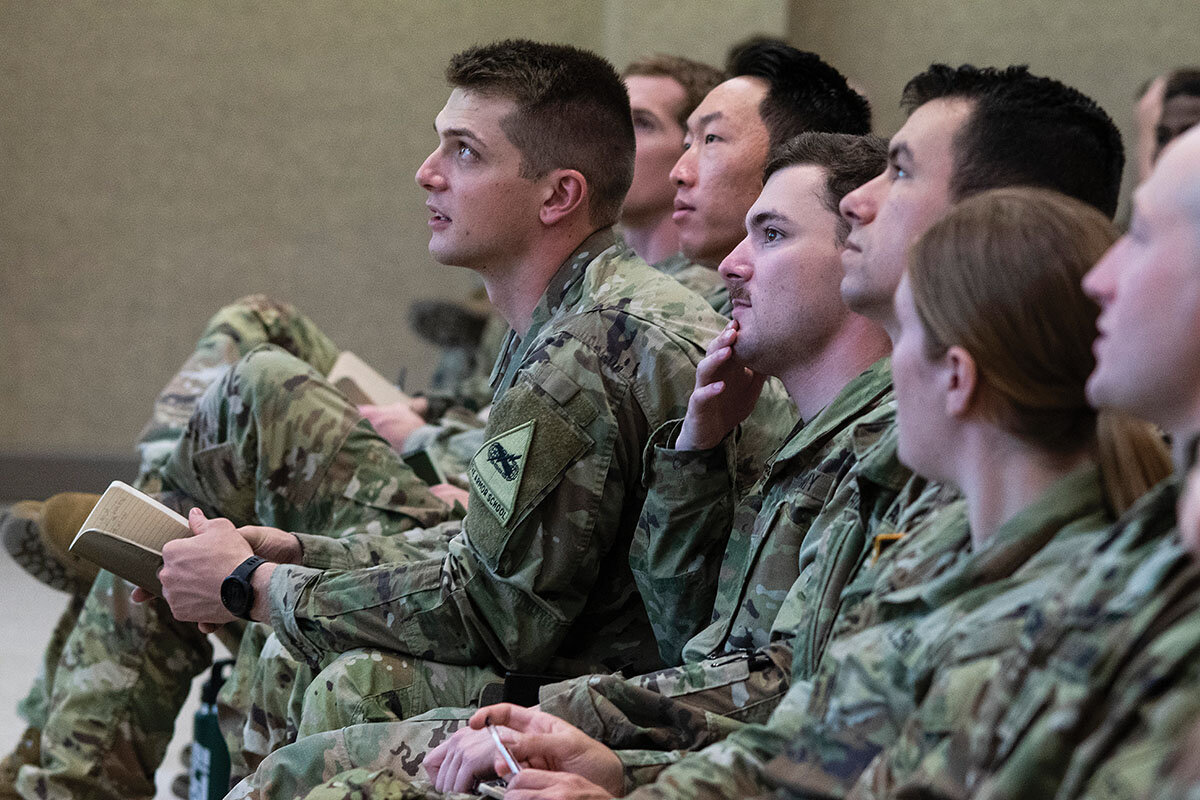 “I came in aggressive,” the chaplain explains of his lecture. He wants students to know that in the swirl of training, ethics “is the main event, not a sideshow.” The saying is a favorite of a teacher noted for his storehouse of memorable quotes: “You are the standard.” “Be that person.” “Leaders are readers.” “Be there.” “Beware, lest you become the monster you perceive your adversary to be.”