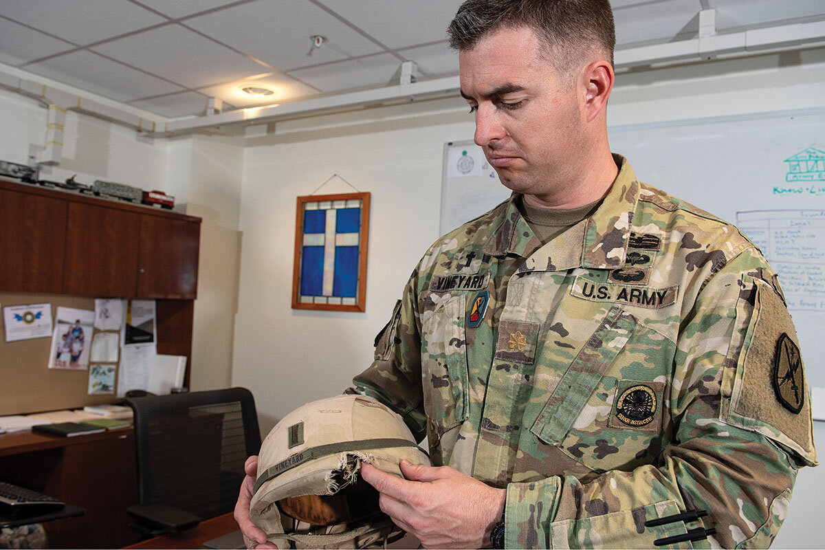 Inspired by his grandfathers, who both served in World War II, Major Vineyard knew as a child he wanted to be a soldier. War became real for him on Sept. 11, 2001. A senior at West Point, arriving for a lecture on terrorism, he along with his classmates initially thought the terrorist attacks on the Pentagon and World Trade Center that they saw on the classroom screen were part of a training video. “We’re probably five minutes into class, and no one said a word and everybody just watched,” he recalls. The instructor muted the screen. “He looked at us and said, ‘Gentlemen, your nation is at war. Class dismissed. Go to the barracks and wait for further instructions.’”