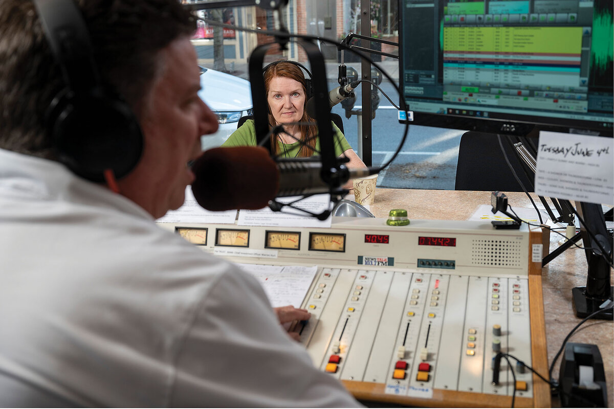 Inside a studio for News Talk 103.7 FM in Chambersburg, Pennsylvania, Michele Jansen is swiveling her chair at a mottled cream desk as the morning sun brightens the storefront window behind her.