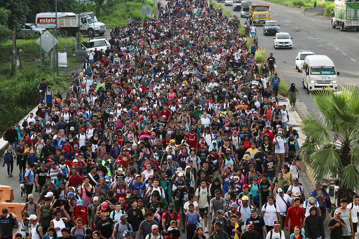 Migrants of different nationalities walk along a road in a caravan toward the U.S., in Tapachula, Chiapas state, Mexico, July 23, 2024.