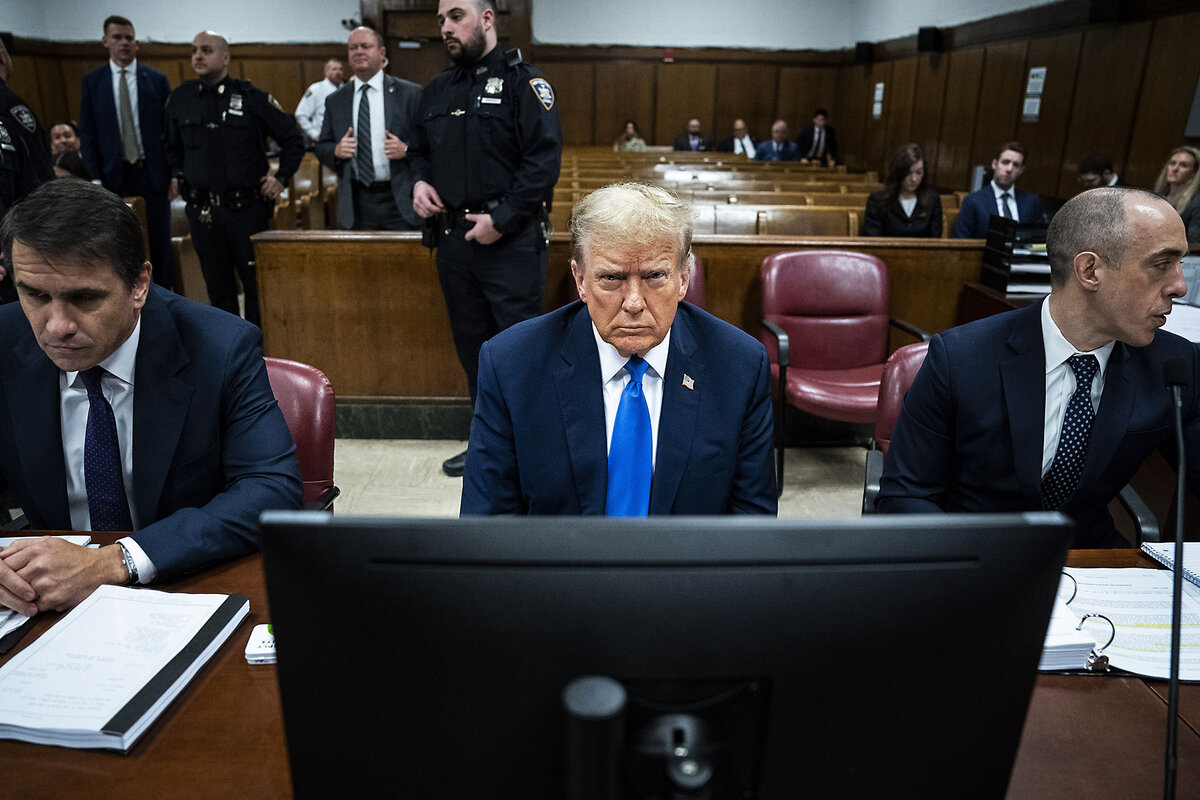 Former President Donald Trump appears at Manhattan criminal court during jury selection in New York, April 18, 2024. He became the first former president with a criminal conviction, after a guilty verdict on falsifying business records with the intent to commit crimes including influencing the 2016 election. He has said he'll appeal the ruling.