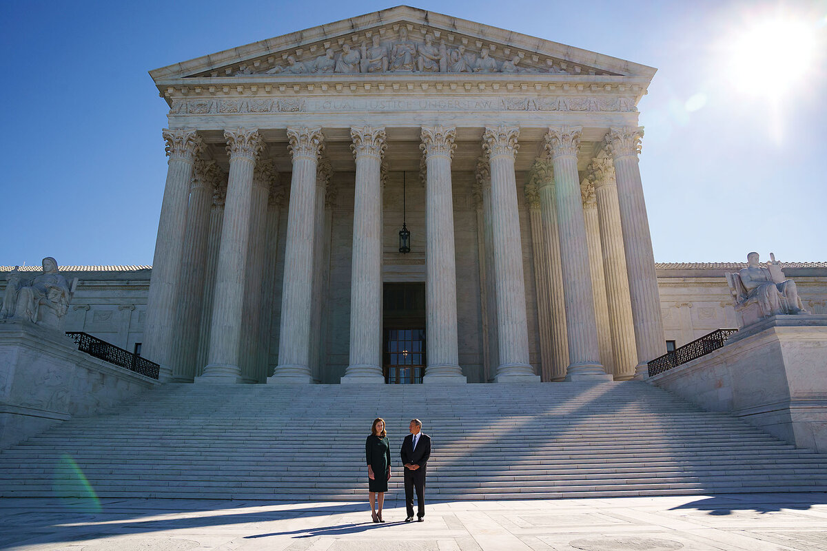 Associate Justice Amy Coney Barrett (left) talks with Chief Justice John Roberts at the Supreme Court in Washington ahead of her 2021 investiture ceremony.