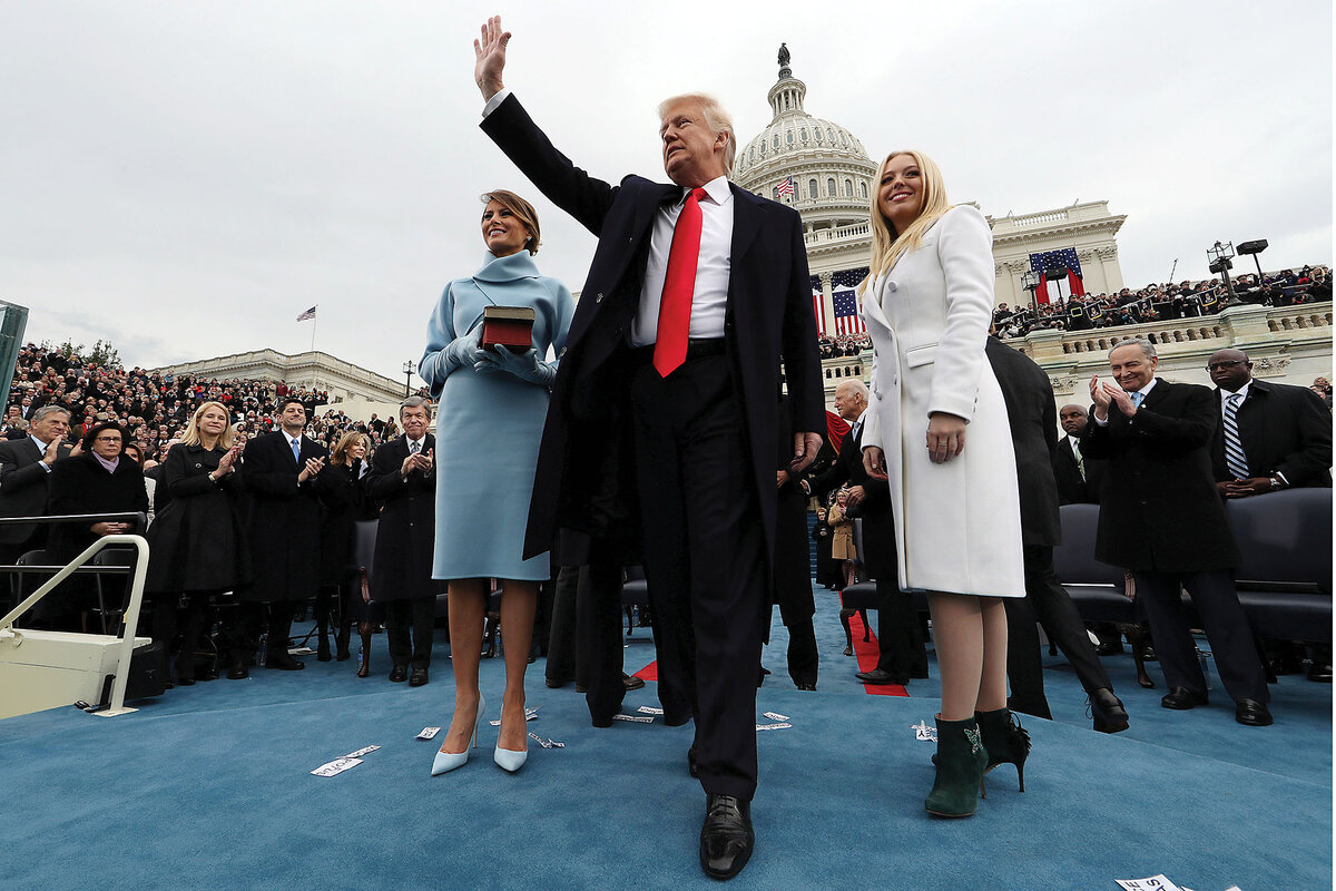 President Donald Trump waves after taking the oath of office as his wife, Melania, holds the Bible, and Tiffany Trump looks out to the crowd on Capitol Hill in Washington.
