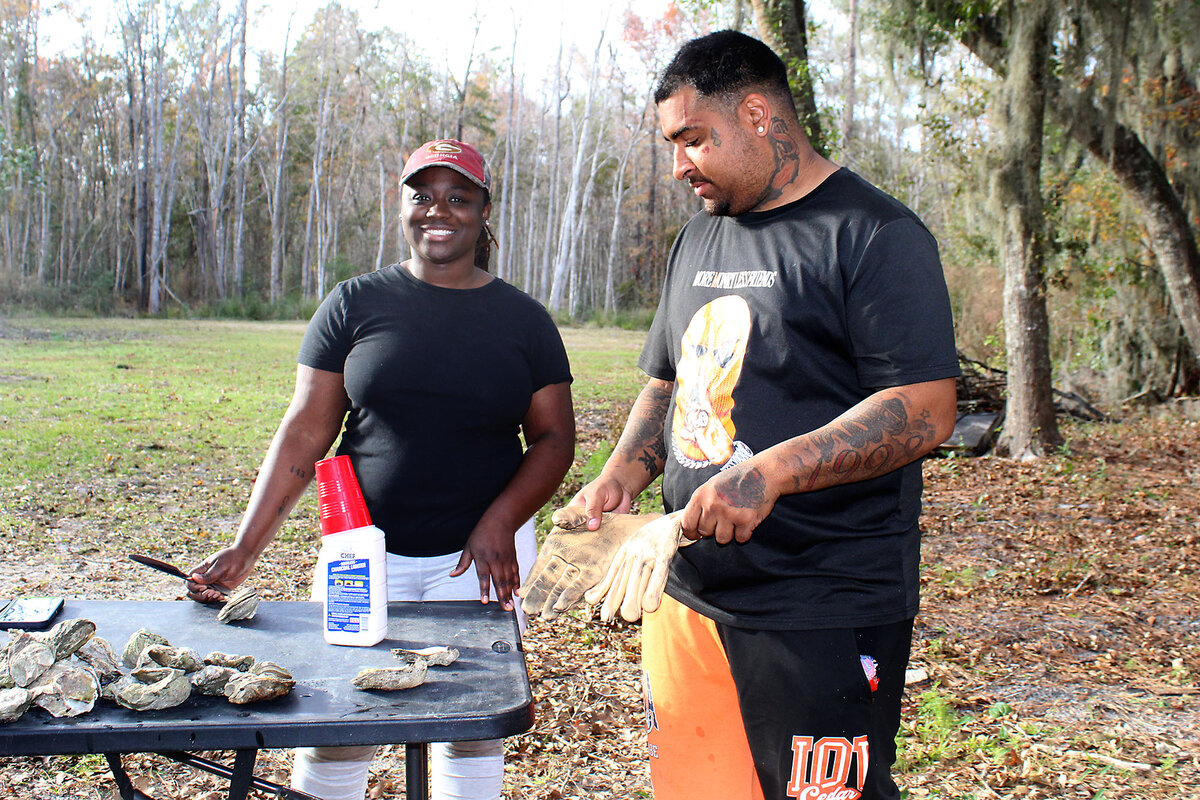 She and her husband, Iddarion, just bought 50 pounds of local oysters for $75. “That was fair,” she says. They held a party, cooking the oysters on a piece of tin roofing over a fire, covering them with water-soaked burlap sacks to steam.