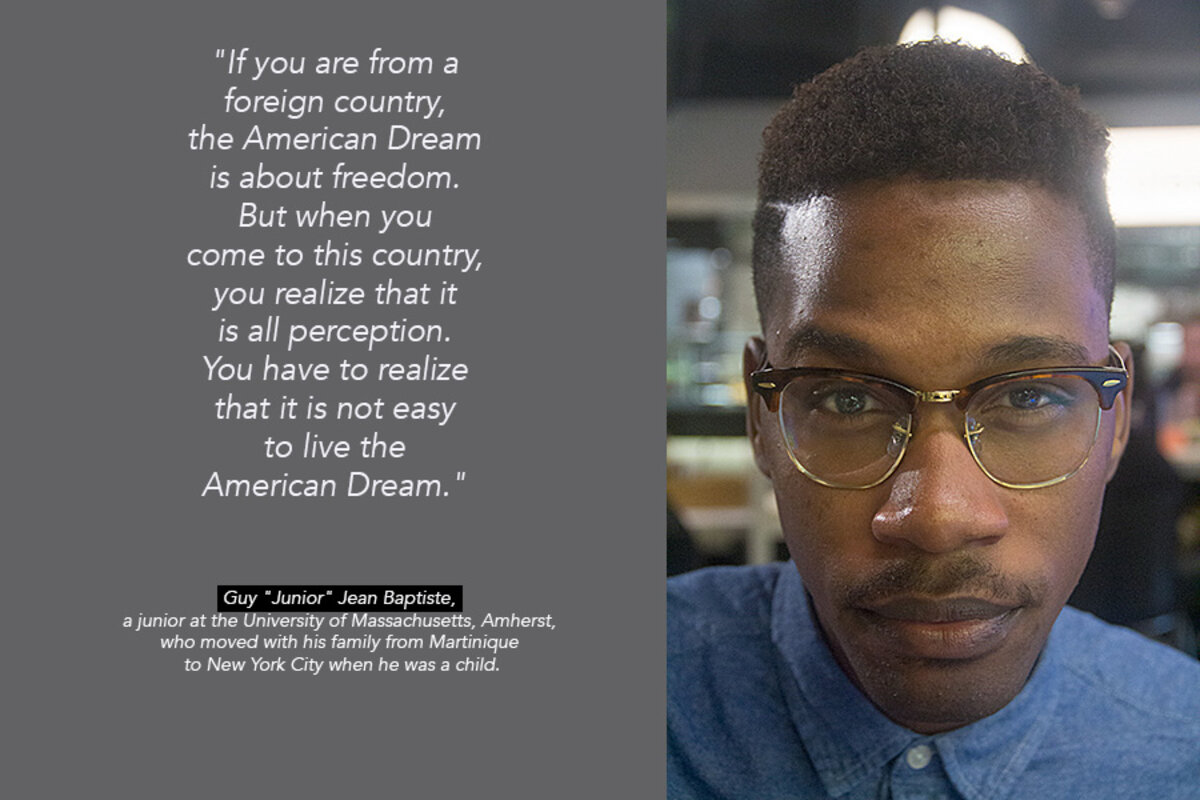 Across the hall at the university cafeteria, Guy Jean Baptiste isn’t so sure. Originally from the Caribbean island nation of Martinique, Mr. Baptiste – “Junior” to friends and family – says the future is less promising for immigrants like him: “People from foreign countries think of America as the land of the free where all is possible. But when you come to this country, you realize that ... it’s not entirely what you expect.”