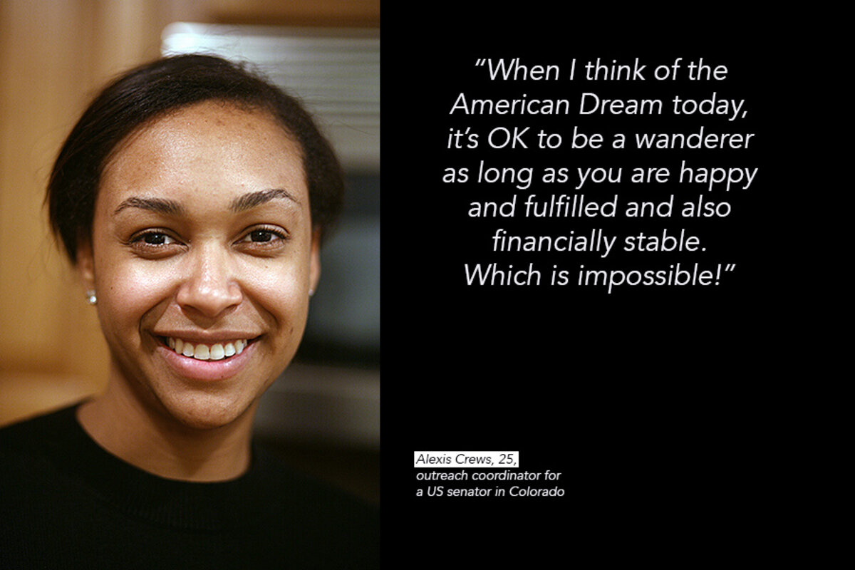 Ms. Crews is familiar with the struggle. She works as the outreach coordinator for a US senator from Colorado. Her dream is to found a nonprofit to help women in developing countries who have been sexually assaulted. Most of her friends, however, have high-stress, high-