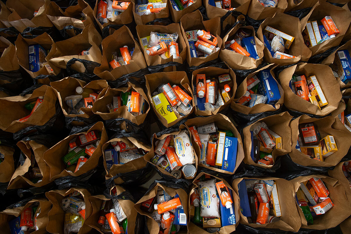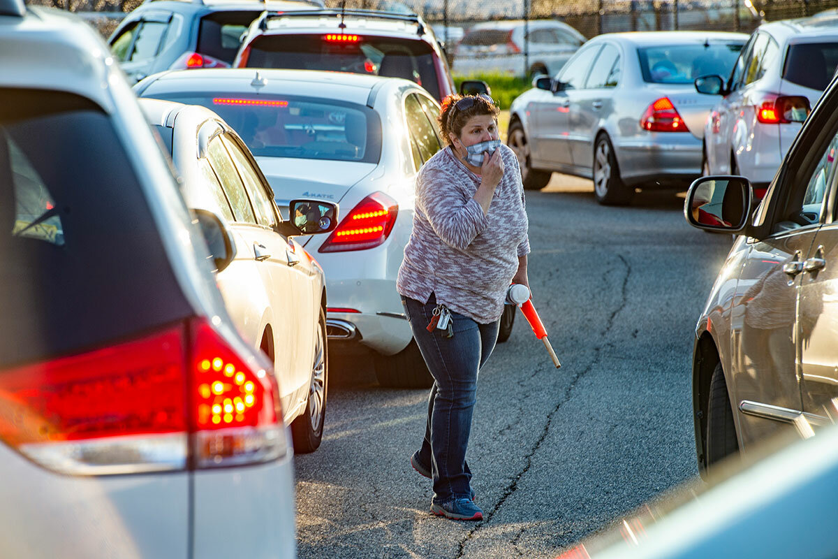 Volunteering comes with health risks. But Mr. Eatough feels the risks are manageable – and worth it. Like other volunteers, he wears gloves, keeps his mask on, and fills bags to feel helpful in a situation that’s left many feeling helpless.