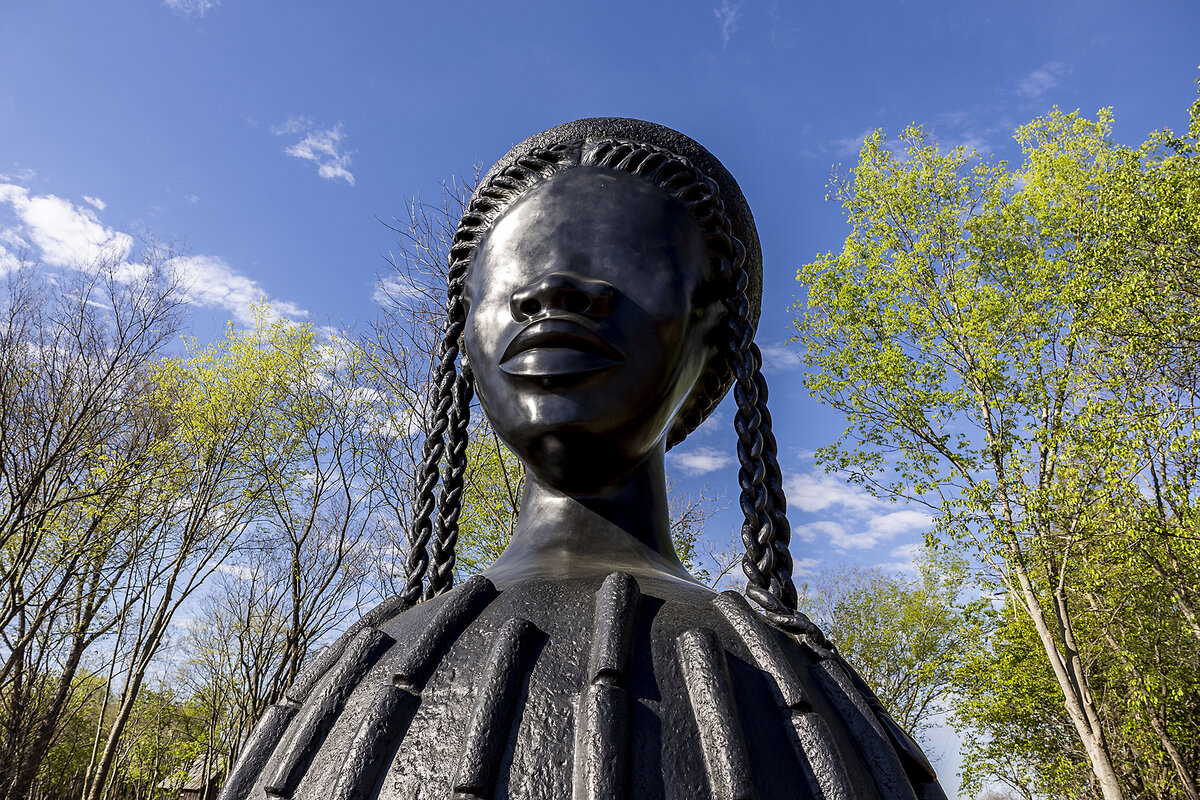 Well, they’re all extraordinary and they’re all meaningful. The experience begins with Simone Leigh’s Brick House, and that piece is particularly meaningful to me because I encountered it in Venice ... two or three years ago. And it was so unexpected to see something that beautiful, that bold, that black, that big, and the figure of a Black woman. It immediately reminded me of my grandmother, who was such a formative person in my life. She was the quintessential African American matriarch. She taught me to believe things I hadn’t seen. And I just didn’t expect to find my grandmother in Venice, Italy, at the Biennale, but there she was. And when I saw it, it made me appreciate the power of art to bring to the light histories and narratives and experiences and stories that have long been hidden. And I knew that the central theme of this site was to do exactly that. So I was thrilled when we were able to persuade Miss Leigh to have that piece at our site. And for me, it just sets the tone in a way that’s really powerful and really important for all the other amazing pieces that people will encounter when they come to the site. The first time I saw the sculpture, I really just wanted to run toward it and hug it.