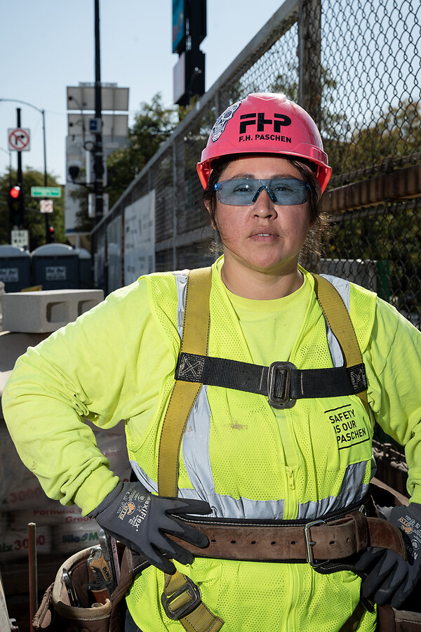 She’s on a team of about 60 workers rebuilding a train station at the edge of the University of Illinois Chicago campus. She’s one of only five women at the site today, the only one on her crew of 10.