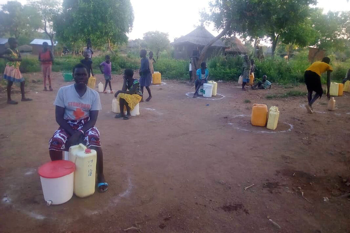 At a Bidi Bidi water pump one recent morning, 10 women sat with their plastic jerry cans inside large chalk circles sketched on the ground, two meters apart. The scene contrasted with the busy, cramped lines that often stretched out from the same spot just last month.