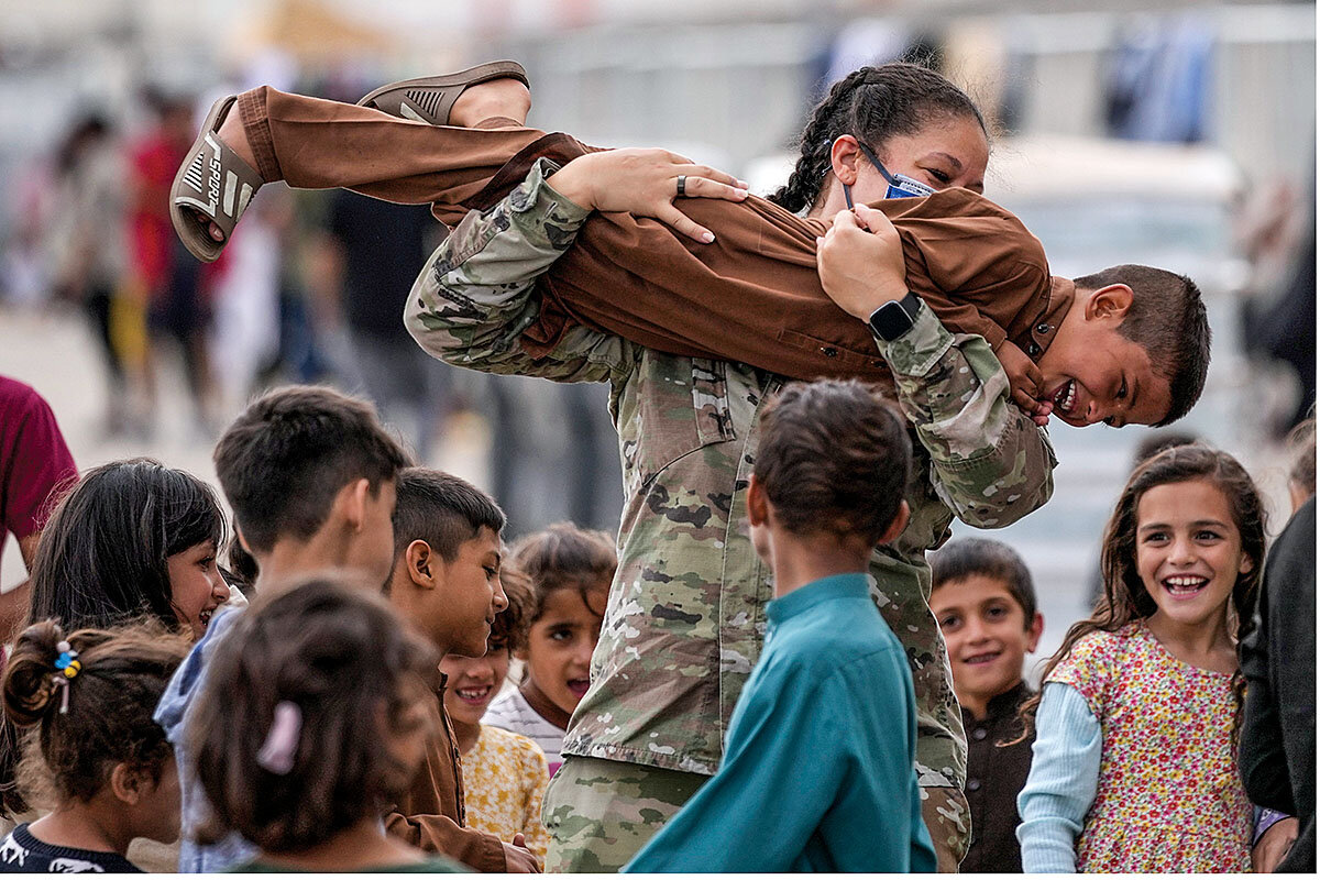 Proudly wearing her college T-shirt, the woman told UNICEF officials that she didn’t feel safe sleeping in the hangar: Other Afghans were bad-mouthing her for having children, no husband, and no headscarf. “I said, ‘We got you. Absolutely keep her in the kinder pod,’” General Olson says.