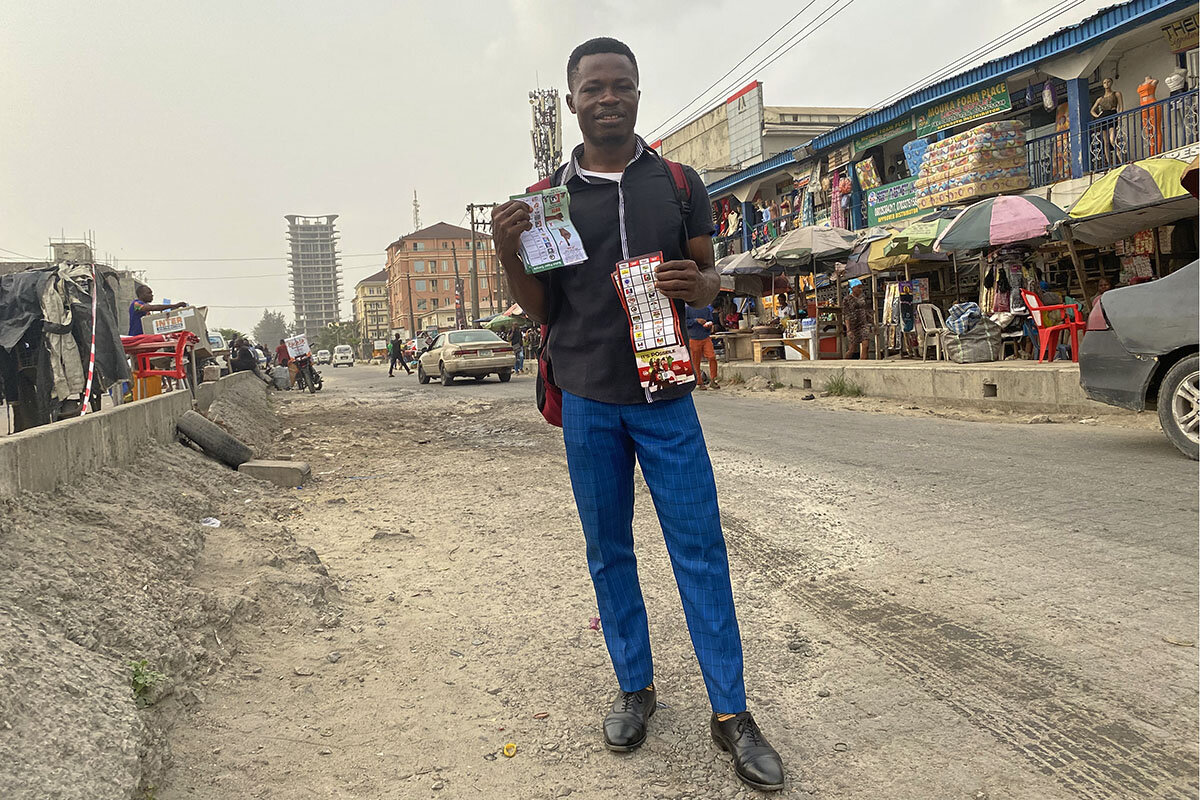 It’s mid-morning on Wednesday in Lagos, Nigeria’s commercial capital, as Prosper Uka sidles up to a group of women standing in a crowd outside a bank.