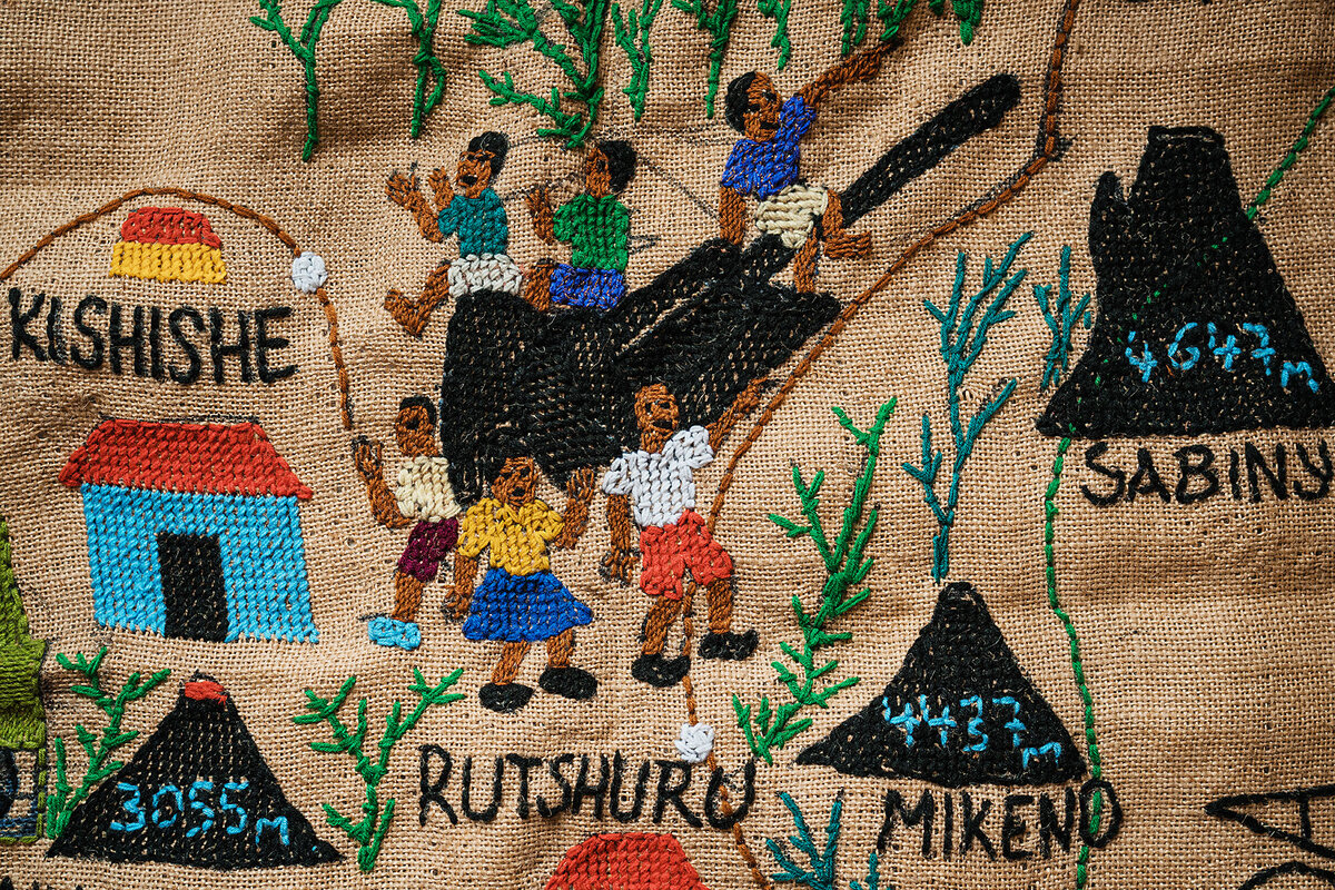“We shall take it up and continue her work,” says her great-granddaughter Phenic Kahindo Musyanilya, while weaving images of different villages caught in battles between rebel factions in the M23 conflict. “The history will not disappear nor be forgotten.”