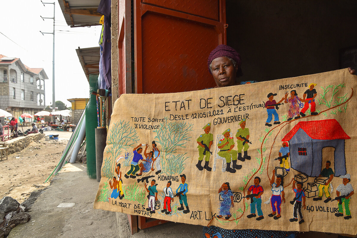 I first met her in July 2024 . Back then, the walls of her studio were covered inch to inch with her tapestries. They depicted the long arc of eastern Democratic Republic of Congo’s history, including scenes of Belgian colonial rule, the civil wars of the 1990s, and recent massacres. Now, everything is packed in plastic bags. Ms. Kamuswekera says she is afraid they will be stolen by bandits roaming the city or spotted by dangerous agents. “If M23 finds this, they could kill me,” she explains quietly.