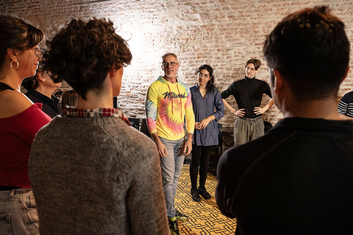 Leandro Orellano (back right) listens to instructor Augusto Balizano (back left) during an inclusive tango master class in Buenos Aires. Those promoting an alternative approach to tango say its goal is to make a beloved national cultural icon accessible to everyone.