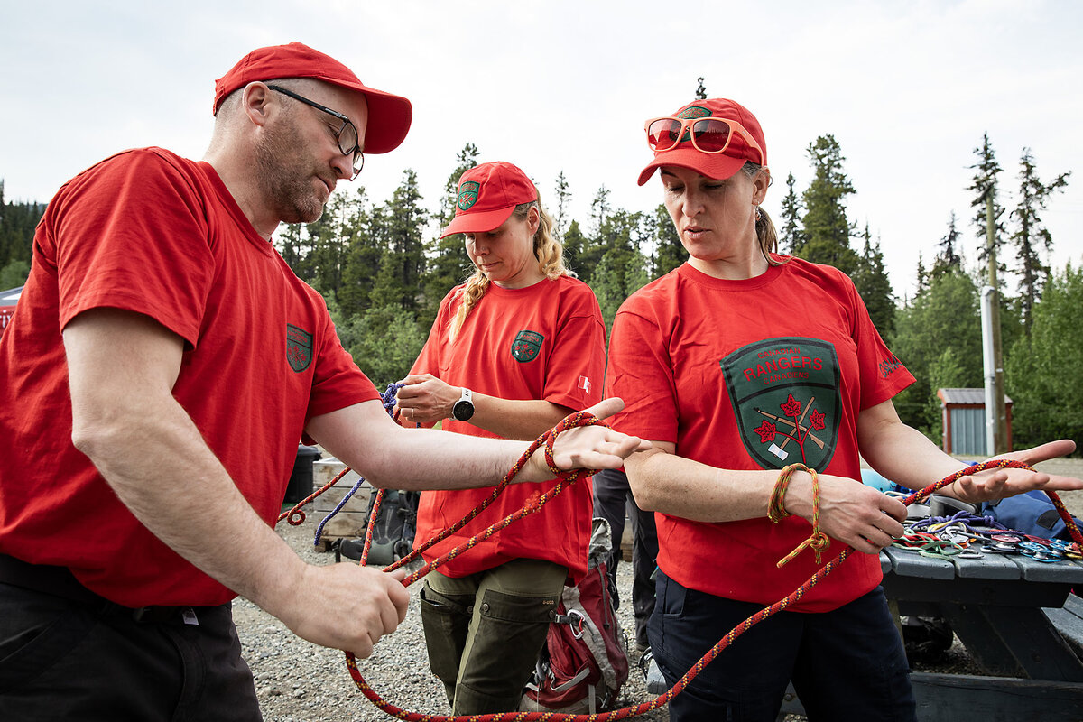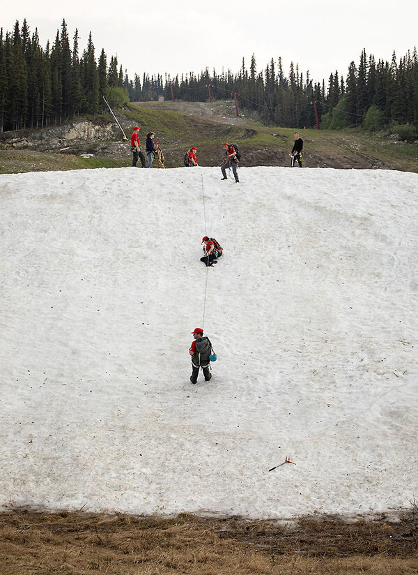 The group of four, in T-shirts on a June day with almost 24-hour sun, follows his commands, stopping their fall on a ski slope still covered with patches of snow outside the capital of the Yukon in Canada’s far northwest.