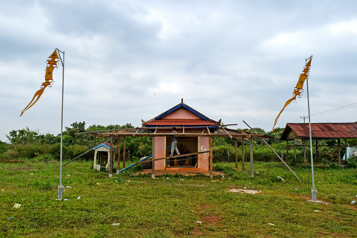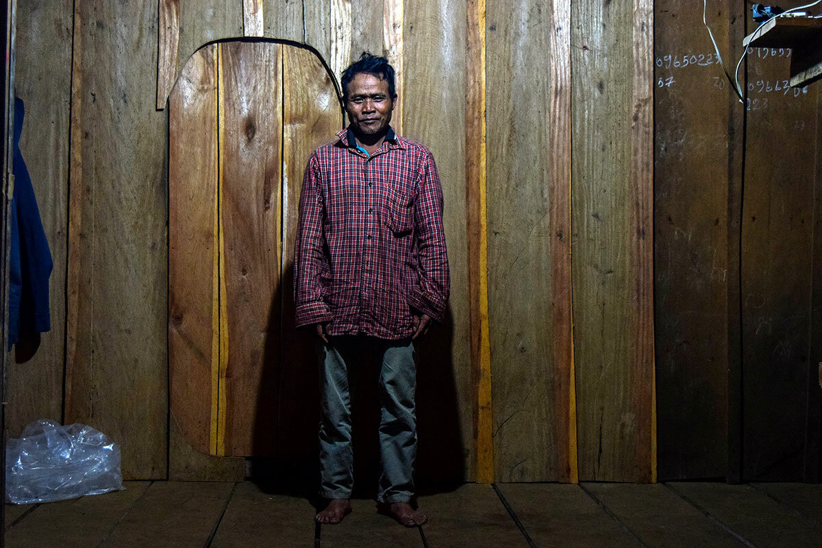 Wearing the everyday clothes of rural Cambodia – old jeans, faded collared shirt, and sandals – plus a GPS and machete, he ventures through forest rivers to investigate signs of illegal hunting. This time of year, amid the six-month rainy season, “it is much harder to walk around the area where they live, as the water is deeper and the plants higher,” says Mr. Put Poeurn. But even when checking crocodile nests, he’s not scared: thanks to his yearly offering at a forest shrine, he says, the crocodiles will leave him be.