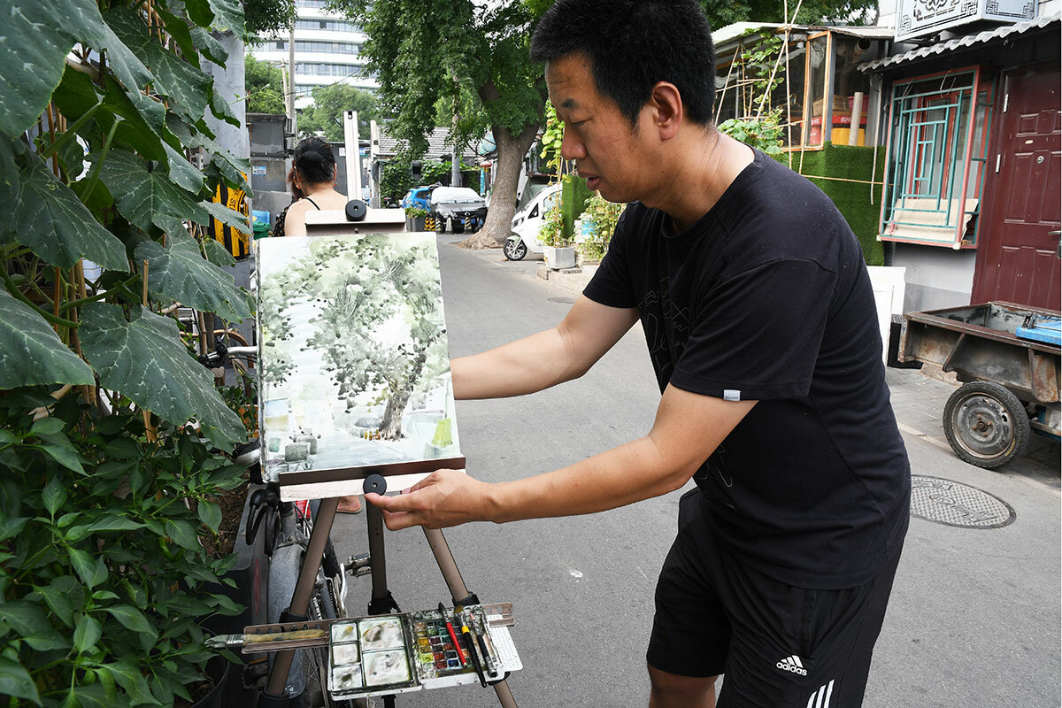 The leafy summer setting in the old alley, set against the backdrop of Beijing’s high-rises, offers inspiration for Mr. Liu, an architect by trade who paints both for leisure and in drawing up designs. “Here my paintings can contrast the traditional hutongs with modern architecture,” says Mr. Liu, who belongs to a painters’ group in Beijing.