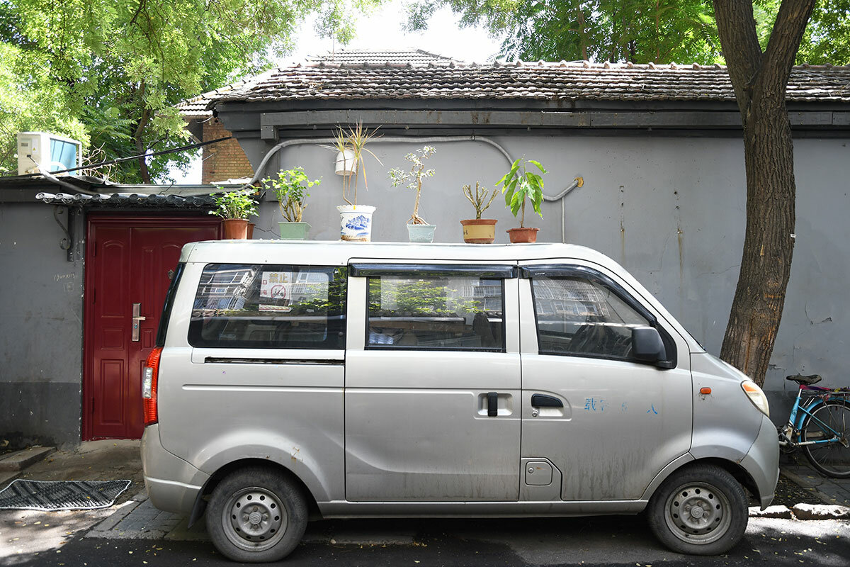 The grower of the loofah gourds, Zhao Guangliang, steps out his door carrying a potted tomato that needs a sunnier exposure. Space is precious in the hutongs , where people live in crowded conditions and share public toilets. So gardeners must be creative. Assisted with strategically placed bamboo, they use every nook and cranny for plants. One of Mr. Zhao’s neighbors arrays plants on the roof of an unused van. Mr. Zhao opts, for now, to seat his tomato on a small chair.