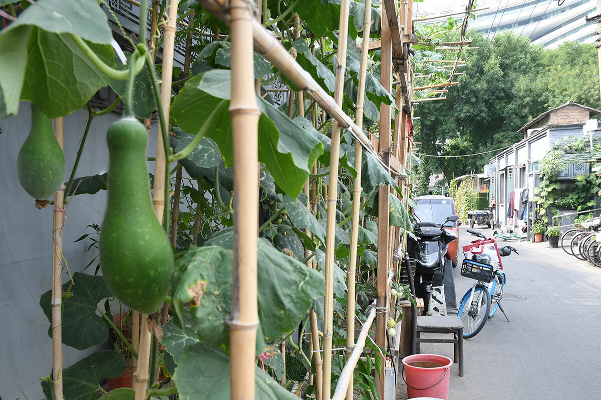 A longtime hutong resident, Mr. Zhao eagerly shows a passerby his winter melon plants, and hot peppers. Then he springs a pop quiz: “What’s this?” he asks. “Hmmm….a ‘kugua’ [bitter melon]?” the passerby ventures, tipped off by the melon’s bumpy skin. Mr. Zhao beams. “Correct!” Encouraged, he guides the visitor across the alley to check out his neighbor’s bumper crop of cucumbers and eggplants, pointing out a big gourd clinging to a surveillance camera.