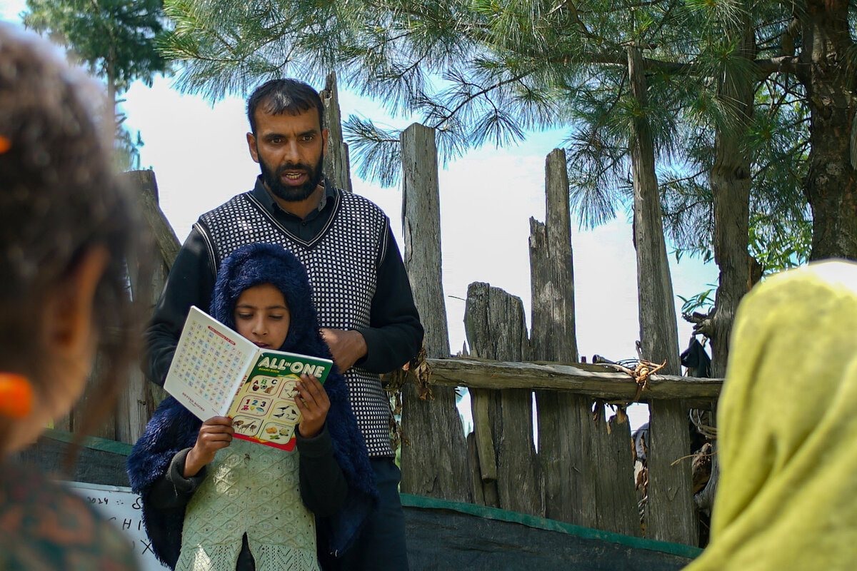 When he arrives, a group of 16 children is waiting in the tree shade – all are members of Kashmir’s remote, pastoral communities, where literacy rates have historically lingered around 30%. As his whiteboard goes up, 16 books open, and the courtyard reverberates with recitations.