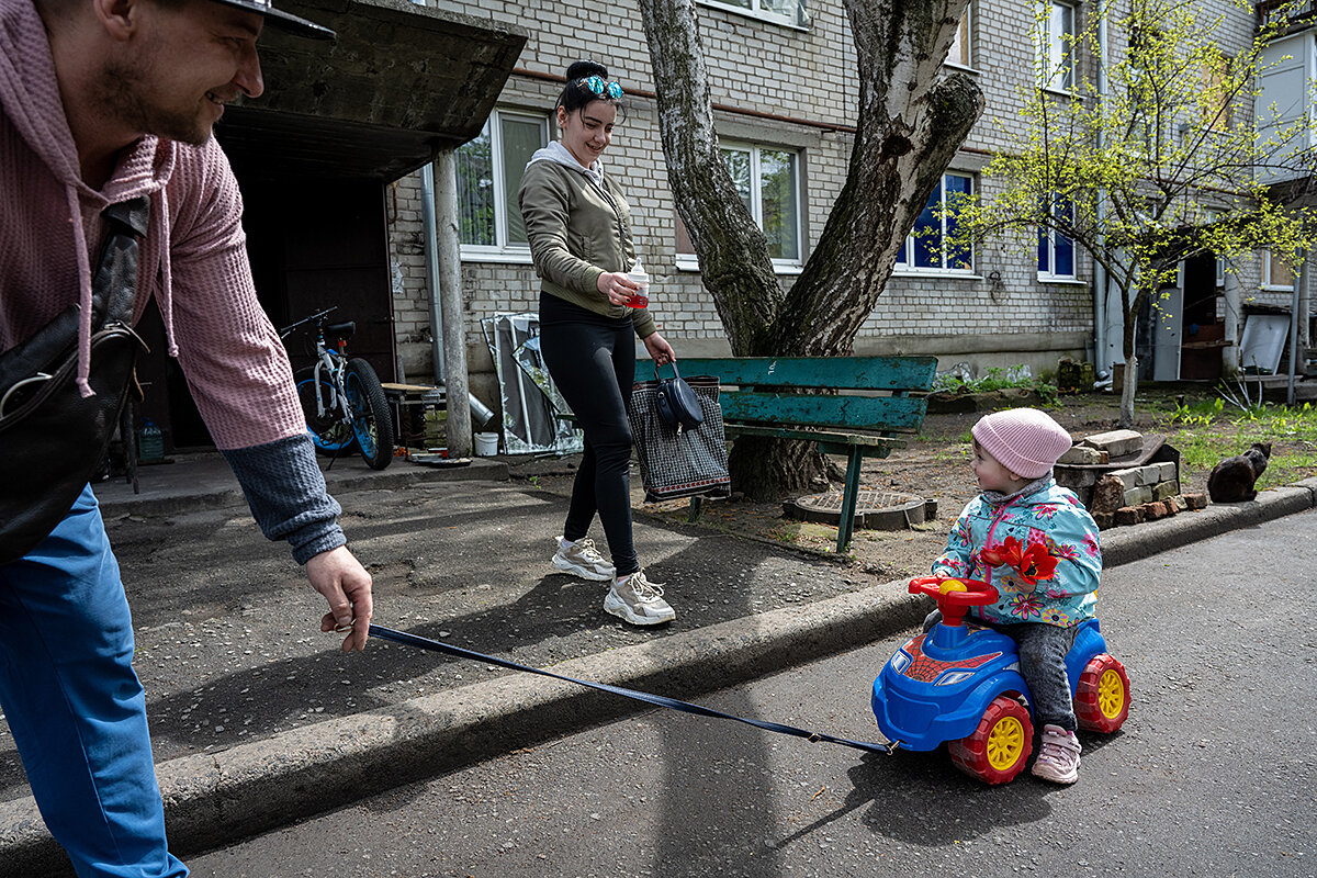 A similar conclusion is made by Ihor and his wife Tetiana, whose 2-1/2-year-old daughter Valeriia clutches several red tulips while riding a toy car on an early spring afternoon. They are beside a multistory apartment building, where running water has not yet been restored and the glass is often missing – smashed by a Russian rocket that landed nearby last February or by explosions from any of the other frequent Russian attacks.