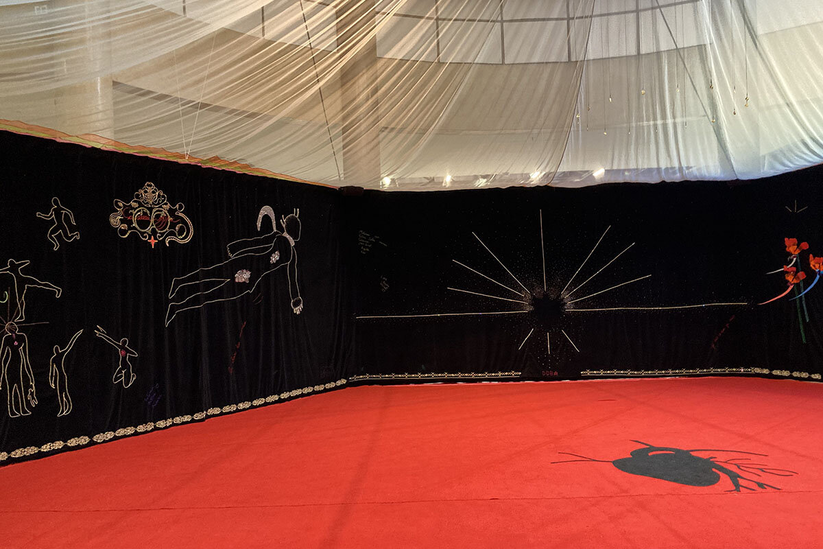 For the four young visitors diagnosed with autism, Le Hamo is a welcome respite after their morning visit to the museum. There, some members of the group wanted to touch the intricate beading and colorful threads on the tapestry of “Infinite Vessel” or lie down on the red carpet inside the gauzy tent. They were not allowed, but inside Le Hamo, interacting with art is not just permitted – it is the goal.